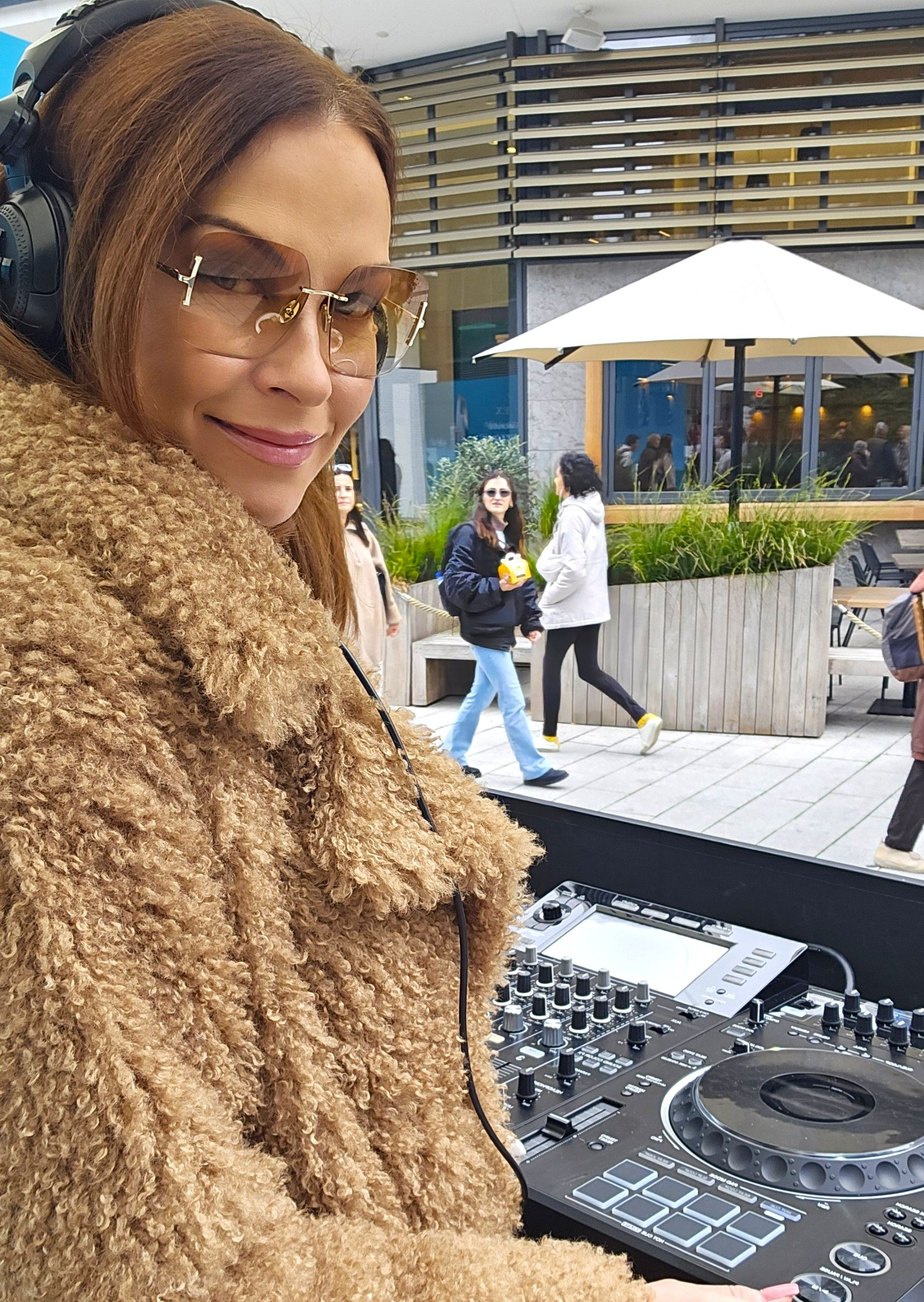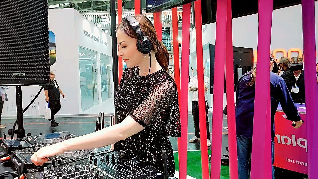 DJane Alegra Cole legt am Stand von Solplanet Lounge Musik und Funky House