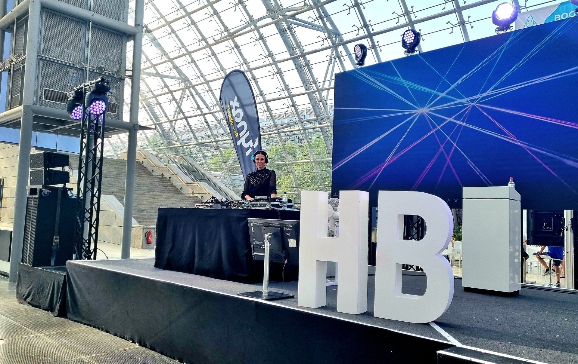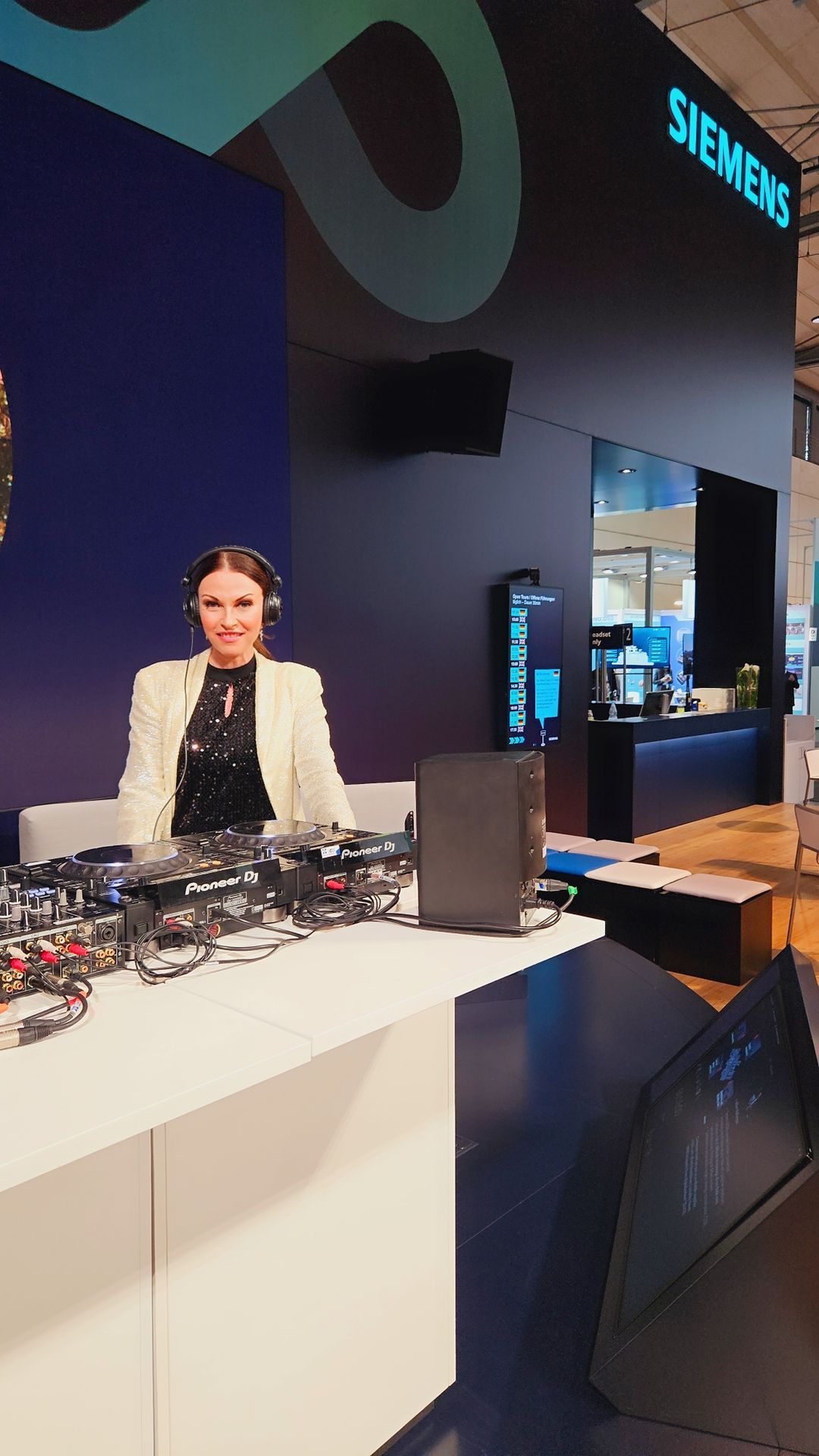 DJane Alegra Cole legte am Messe Stand von Siemens zu Beginn chillige Beats und später akteulle Charts und Funky House Music auf.