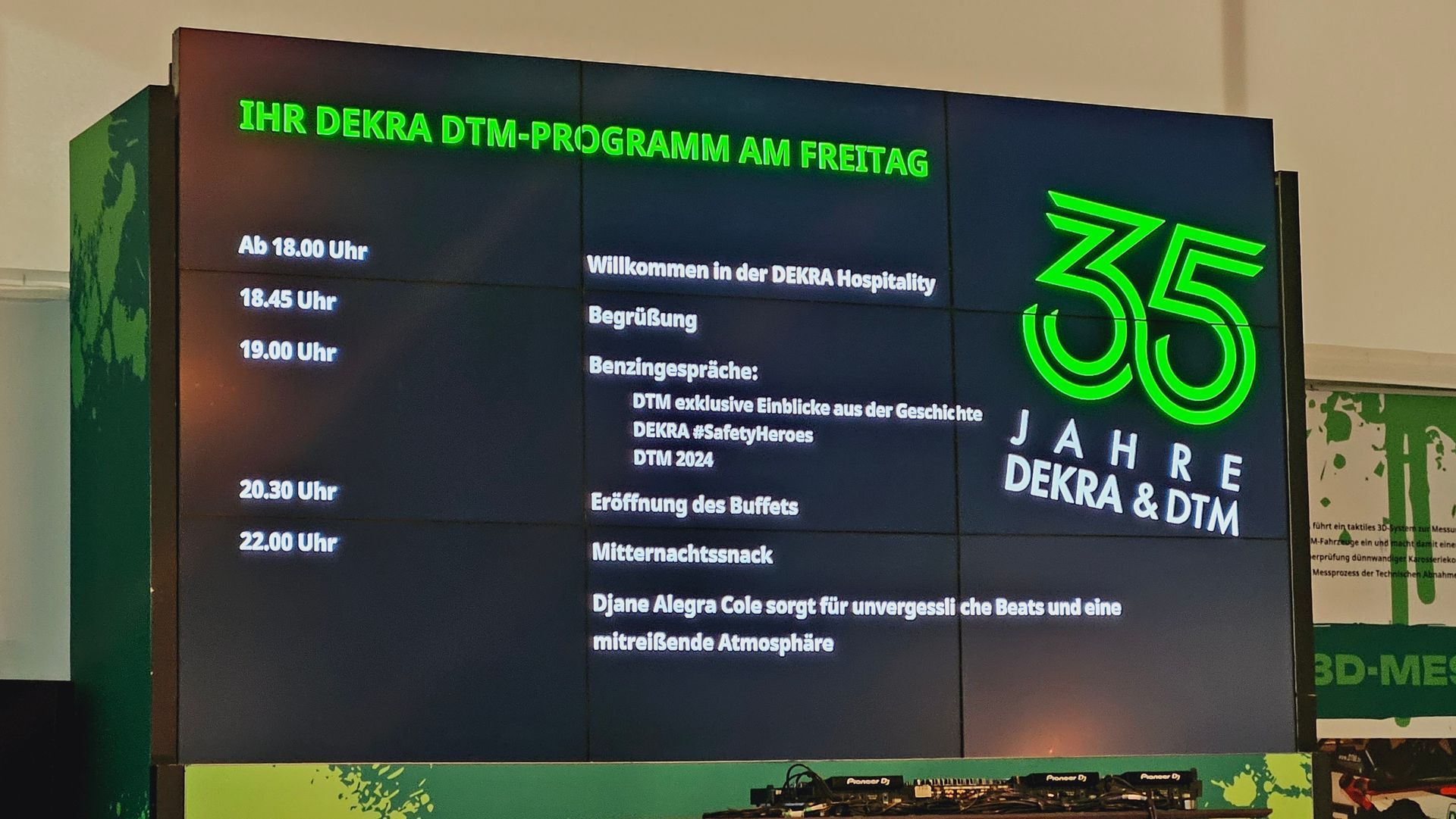 Mit ungefähr 500 Gästen aus dem Motorsport, darunter viele Prominente wie Formel 1 Kommentator und ehemaliger Automobilrennfahrer Ralf Schumacher, sein Sohn und DTM Fahrer David Schumacher, Ex Motorsportchef von Mercedes Benz Norber Haug und vielen weiteren Persönlichkeiten feiert die DEKRA ein chilliges Get Together Event zum 35 jährigen Jubiläum. DJane Alegra Cole legt zu beginn chillige Beats und zu später Stunde Charts und Funky House Beats auf.