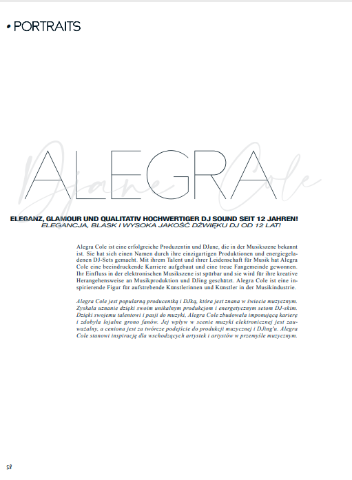 Qualität, Stil und musikalisches Feingefühl auf höchstem Niveau – mit einem perfekten Mix aus modernem Deep House Sound, trendigen Nu Disco Beats und aktuellen Charts verwandelt DJane Alegra Cole jedes Event in ein unvergessliches musikalisches Highlight.
